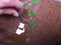 To give you a good start, you need sufficient plants from the beginning (around 80% of the overall tank should be planted). Ground covers like Hemianthus callitrichoides "Cuba" are divided in small portions that are planted at a certain distance. Here we use the plants we have cut in quarters beforehand. Later on they will form a nice "lawn". A pair of pincers facilitates planting enormously.
